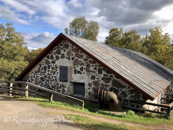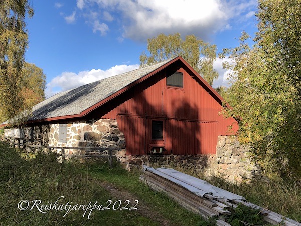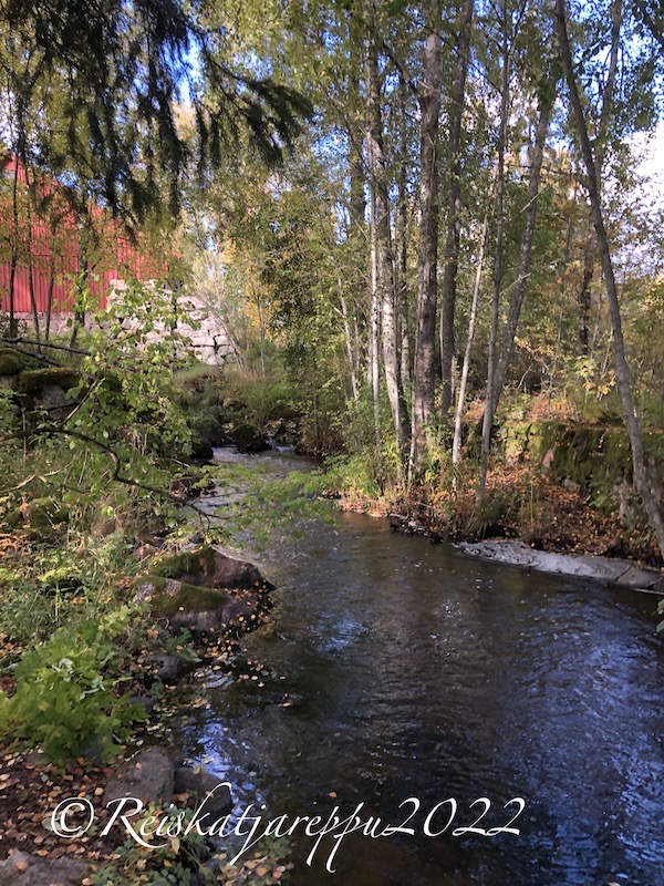 Kävelimme suoraan alajuoksulle, jossa oli näkyvillä jotkut rauniot. Tyyni koskenalajuoksu ja ruskan värjäämä maisema. Sattui hieno päivä käydä katsastamassa tämä paikka, vaikka ei suunnitelmissa ollutkaan tai oikeastaan emme tienneet paikasta mitään. Nämä ovat näitä mutkia matkassamme, mitä melkein aina sattuu. Henkäilimme ja nautimme olemassa olostamme täällä kauniilla paikalla.