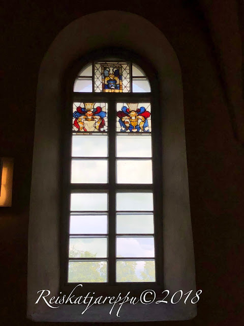 Ikkunassa on kolme lasimaalausta. Ylimpänä on Aatelisuvun Boije af Gennäs vaakuna, teksti Nils Andersson Boije 1559. Vasemmalla Stålarm-suvun vaakuna 1567 ja teksti Elin Eriksdotter 1567.