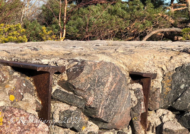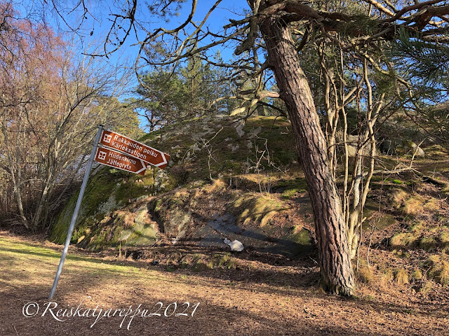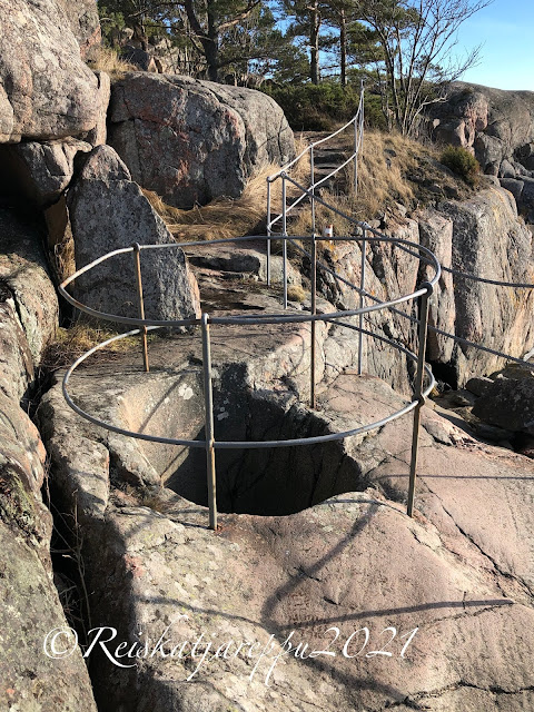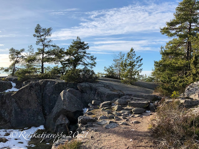Meidän tarkoitus oli mennä rannan vieressä olevalle Puistovuorelle. Polkuja oli, mutta ne olivat niin jäisiä, että halusimme pitää raajamme ehjinä. Käännyimme takaisin ja lähdimme katsomaan Puistovuoren toista puolta. Siellä oli Hangon Casino ja avoin meri. Rakkauden polku ja hiidenkirnu. Ja kalliot. Me päästiin kallioille. Ekat kalliokiipeilyt.