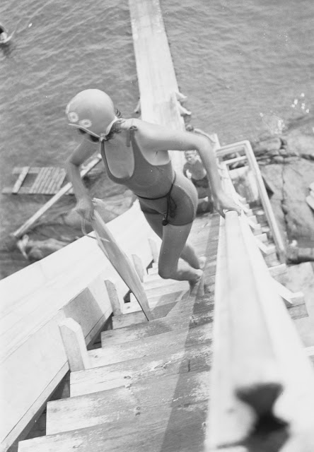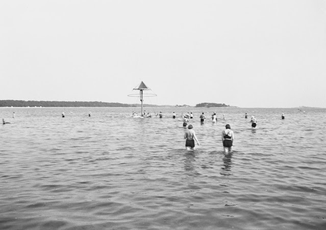 Tämä Plagenin uimaranta on kuulunut Hangon kylpylän uimarantaan vesiliukumäkineen, vedessä olleisiin kiikkulautoineen sekä näkyvine vesikaruselleineen. (Vesikaruselli voi olla uusittu). Kuvia katsellessa näyttäisi, että männyt ovat pysyneet samankokoisina kaikki nämä vuodet.