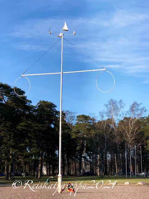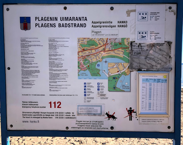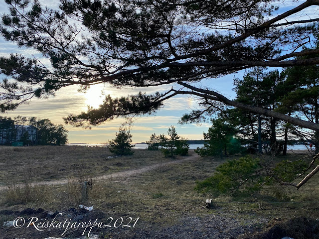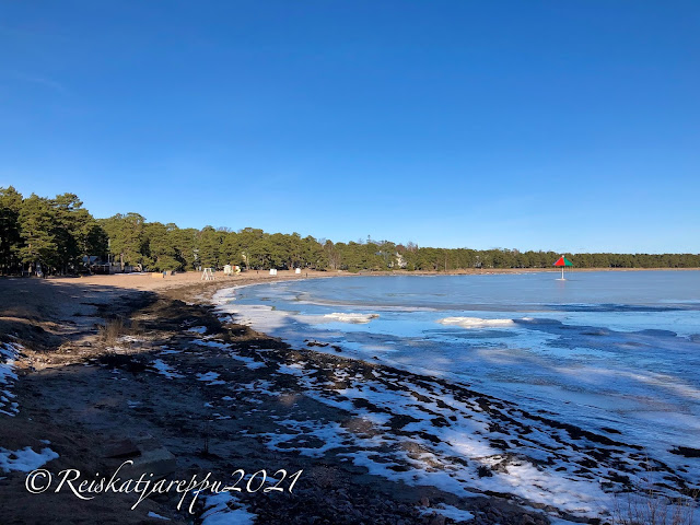 Mikä olotila syntyikään, kun astuimme Hangon uimarannan parkkipaikalta ulos. Ihana lämpö, lintujen liverrys, aurinko! Olisin kiljunut, jos olisin kehdannut. Hiekkaranta oli hiekkaa, eikä lumisohjoa. Olipa pari ihmistä jo roudannut aurinkotuolit rannalle ja siinä he lekottelivat kaikessa rauhassa nauttien auringon suomasta lämmöstä. Ulkovarusteet oli heillä yllä, etteivät vielä kuitenkaan uikkareilla.