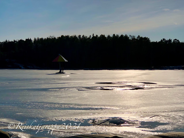 Olimme saapuneet Plagenin uimarannalle, Isolle Kolalahdelle. Lahti oli vielä jäässä. Lähellä olevat pienet kalliot olivat houkutelleet ulkoilijoita nauttimaan auringosta. Kolme pikkupoikaa uskaltautui jäälle tepastelemaan lähellä olevan vesikarusellin luokse. Jännityksellä seurasimme heidän kulkuaan, mutta onneksi tulivat kuivina rannalle.