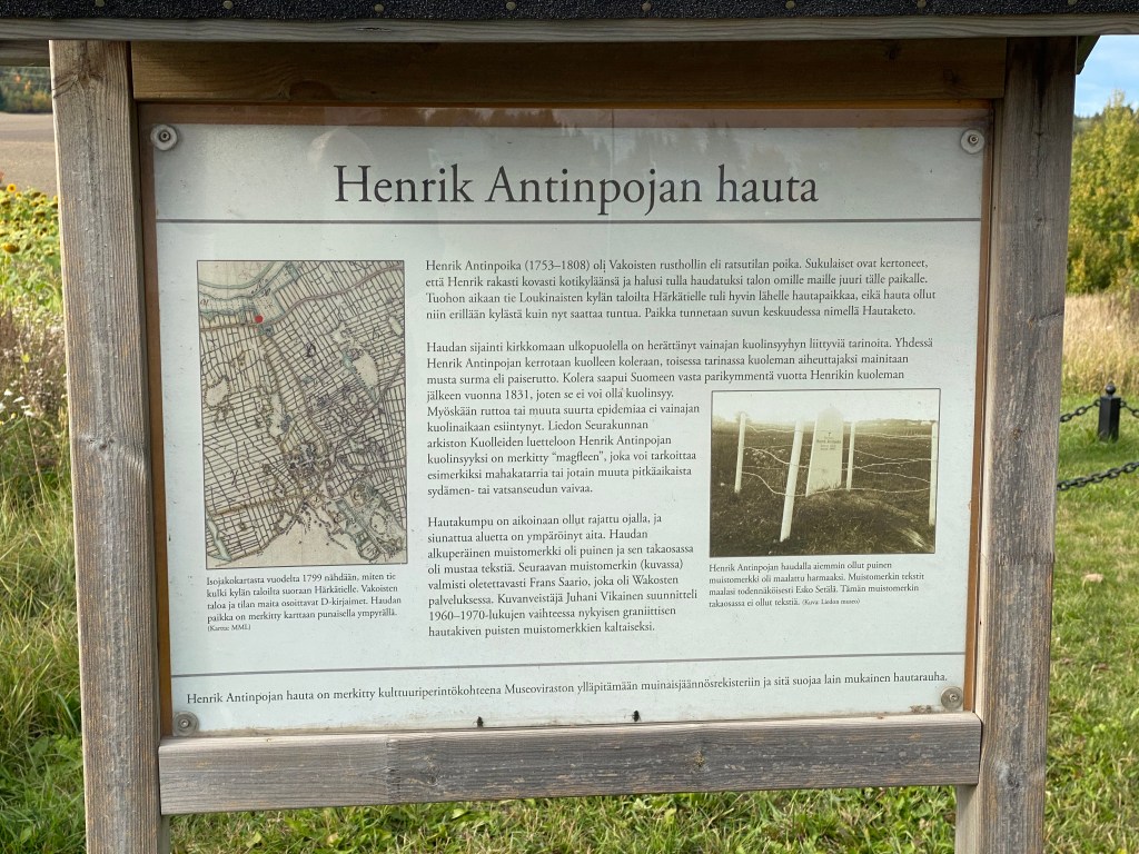 Henrik Antinpoika (1753-1808) oli Vakoisten rusthollin eli ratsutilan poika. Sukulaiset olivat kertoneet, että Henrik oli kovasti rakastanut kotikyläänsä ja halunnut tulla haudatuksi talon omille maille ja juuri tähän paikkaan. Hauta on ollut lähempänä kylää kuin nykyään. Sukulaiset kutsuvat paikkaa Hautaketona.