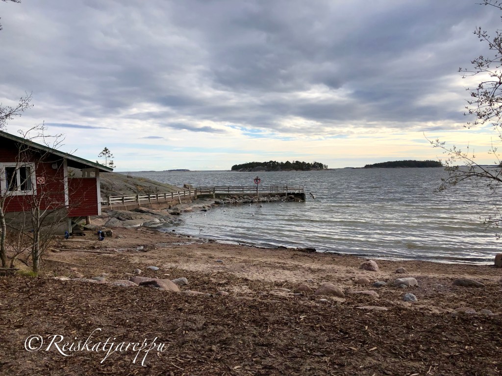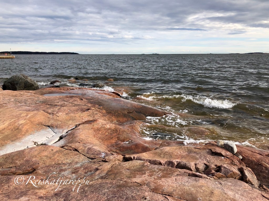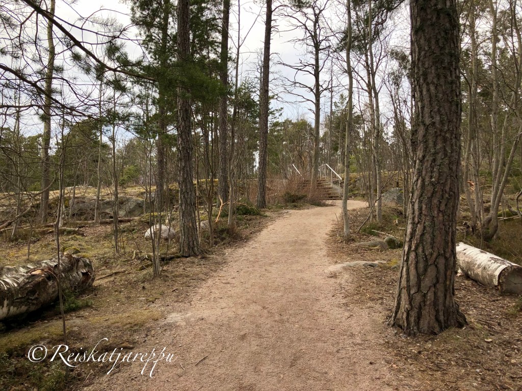 Matka jatkui kallioista polkua pitkin kesäkotien saunarantaan, jossa on myös uimaranta. Kalliolle päästään portaita pitkin, jossa voi istua penkille ja pysähtyä ihailemaan taas sitä upeaa merimaisemaa.