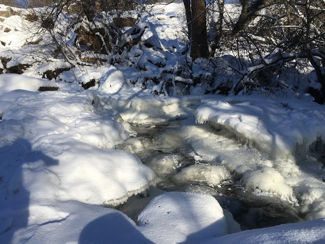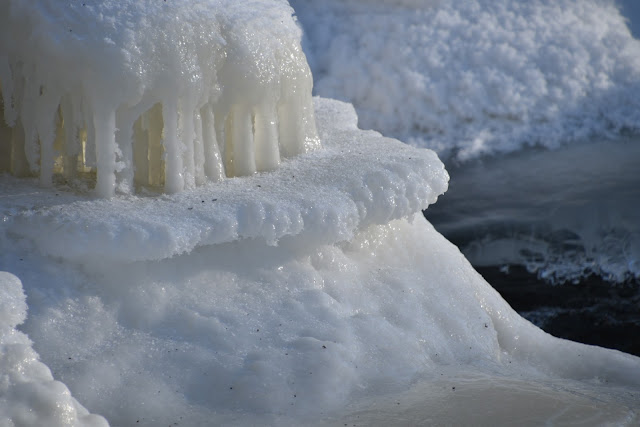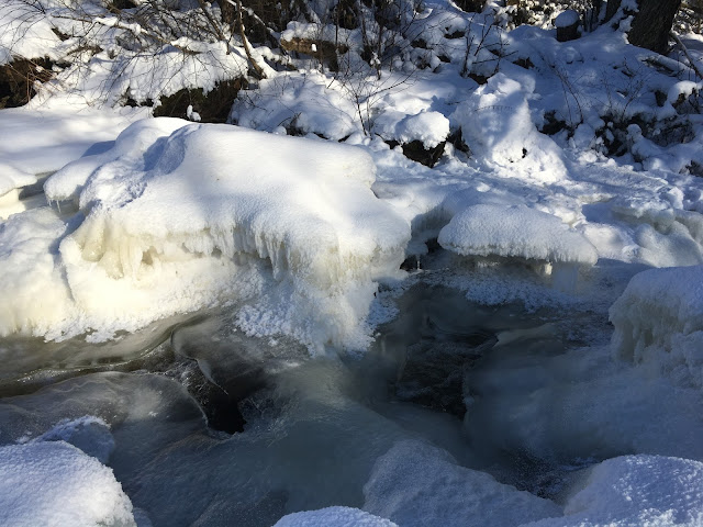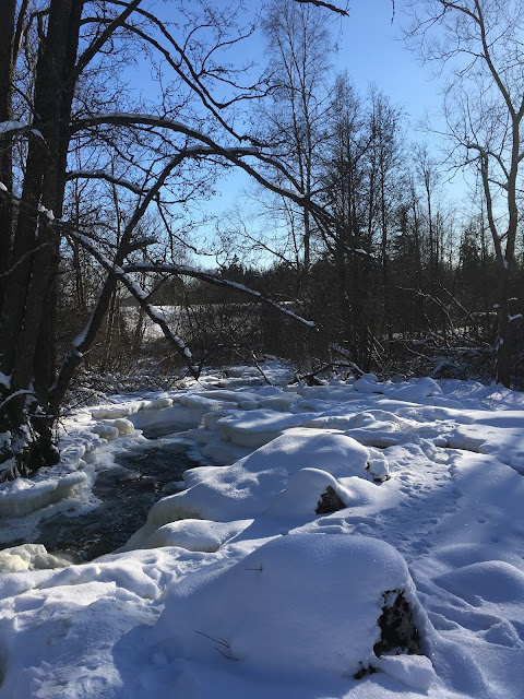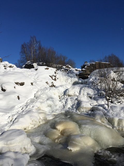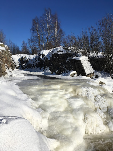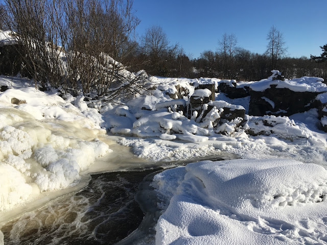 Jäätynyt koski on myös komea näky talvisessa auringonpaisteessa. Jään eri muodot ja hituset ovat kaunista, joka ei valitettavasti aina välity kuvissa. Kosken voi vain kuvitella keväällä kuohuvassa olomuodossaan, joten aika on sitten palata uudestaan Kuhakoskea ihailemaan.