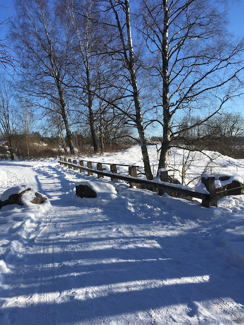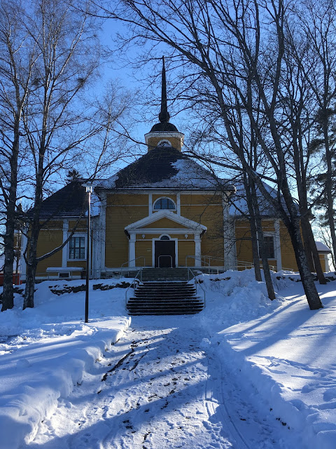 Kirkko oli käytävä katsastamassa ja päätimme suunnistaa Nurmijärvelle. Ajelimme navin ohjeistuksen mukaan ja takaisin kohti Klaukkalaa. Ykskaks neiti Navi käski meidän kääntyä oudolle sivutielle ja tulimme asutusalueella. Ja käännös sinne ja käännös tänne jne. Epäilys alkoi vahvasti herätä ja Krissen navigaattori otettin käyttöön. Päätimme luopua auton navin ohjeistuksesta. Ei voi kuin välillä vaan nauraa näille ohjeille! Kiva oli taas käydä katsamassa yksi asutusalue. Ei mutta kuin takaisin samaa tietä mistä tultiin ja ihmetys oli suuri, kun Numlahden kartanon kohdalta käännyttiin Hongisojantielle kohti Nurmijärven kirkkoa. Siis teimme melkoisen lenkin, kun olimme melkein Kuhakoskella, grrr. Hongisojantien varrella avautuva talvinen maalais -maisema sai hetkellisen ihmetyskiukun laantumaan. Aukeaa, kaunista talvista tasaista peltoa. Viljapellon leikatut, kullankeltaiset sänget hehkuivat kilpaa auringon kimaltamalla lumihangella. Mieli vei kesään ja sai miettimään miltä maisema mahtaa näyttää kesäisinä päivinä.