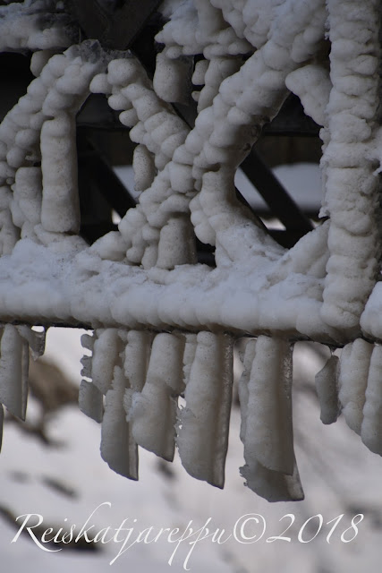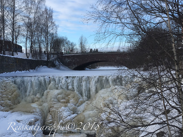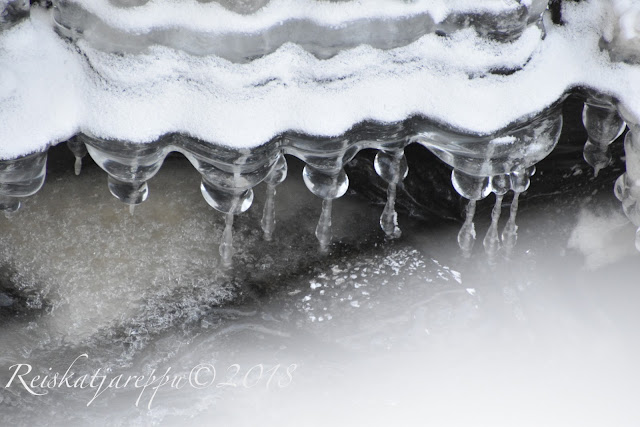 Yllätykseksemme myös tämäkin läntisemmän puoleinen koski oli jäässä. Vaikuttava silti, koko 6 m jäätyneessä korkeudessaan. Miten hienoja jäämuodostelmia luonto luo, ei voi kuin ihmetellä ja ihastella!