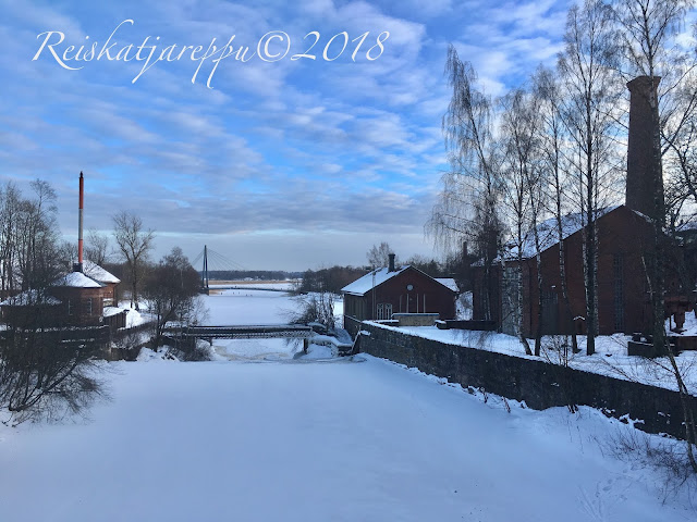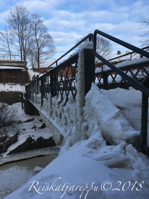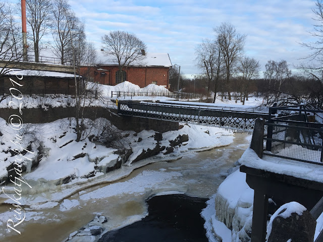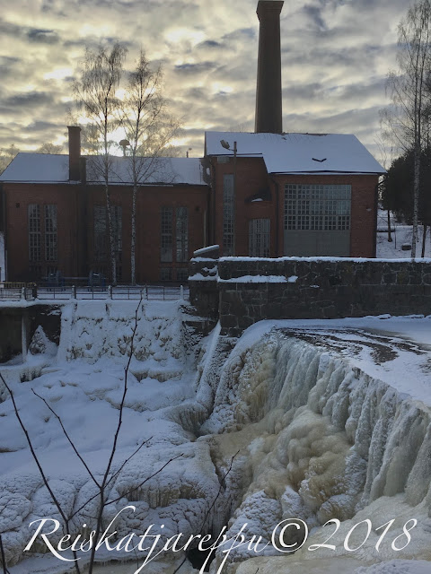 Saaren puolelta pääsee siltaa pitkin Hämeenkadun puoleiselle rannalle. Sillalla ei ole talvikunnossa-pitoa, joten sillan kaiteesta kovasti kiinni pitäen pääsimme muutamat jäätyneet askelmat liukumaan sillalle, samoin toisessa päässä muutamat useammat askelmat. Mielessä kävi, että onko pyllyllään laskeminen paras tapa mennä alas. Kauhunkatse ylöspäin ja vielä yhdet jyrkät portaat ylös ja olimme putouksen kohdalla rannalla sijaitsevan kesäisin aukiolevan Voimalamuseon kohdalla. Alueella ovat 1800-luvulta olevat mylly, höyryvoima- ja vesivoimalaitokset. Vesivoimalaitos on Suomen vanhimmalla koneistolla toimiva vesivoimala.