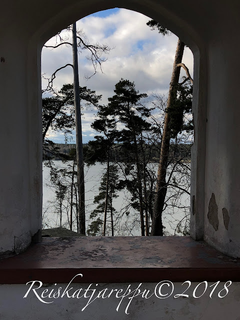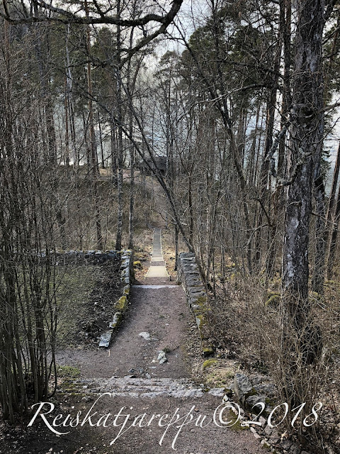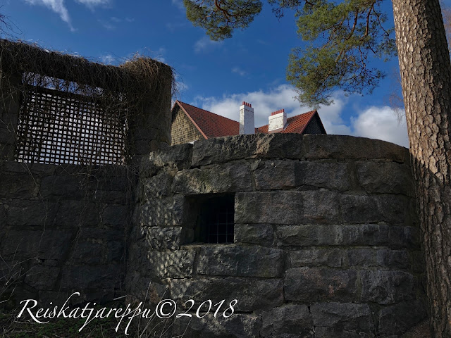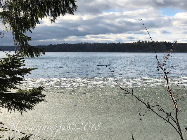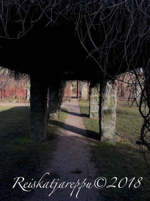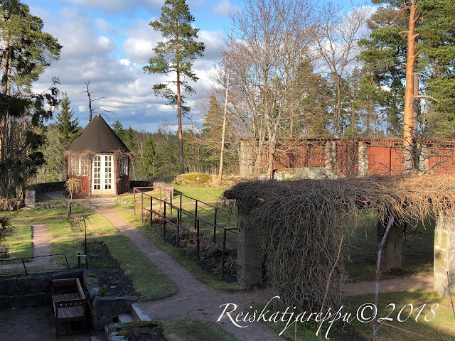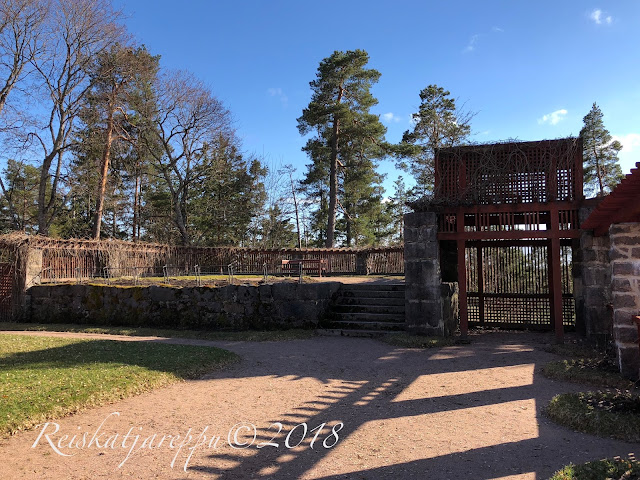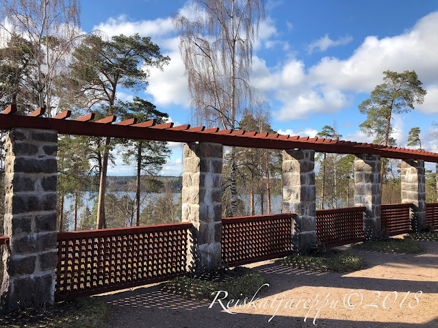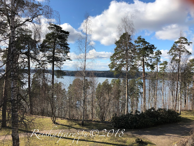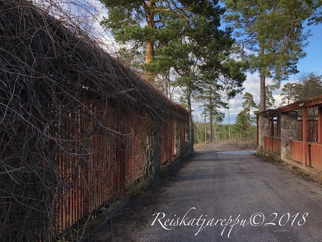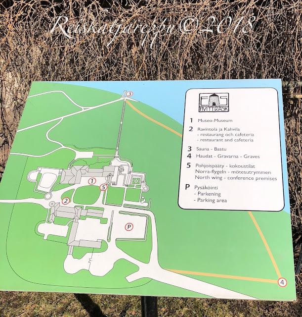 Hyvät opasteet ohjasivat ajamaan korkealle kummulle Vitträsk-järven siintäessä oikealla puolella. Avautui komea näkymä, joka vain parani ajaessamme auton parkkipaikalle, jota ympäröi säleiköt, kietoutuineina villiviinien lehdettömiin köynnöksiin.
