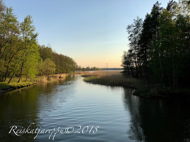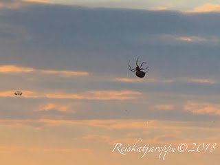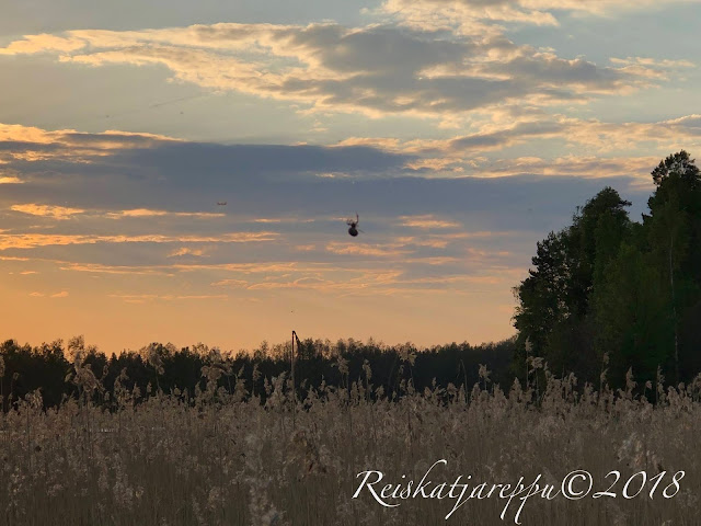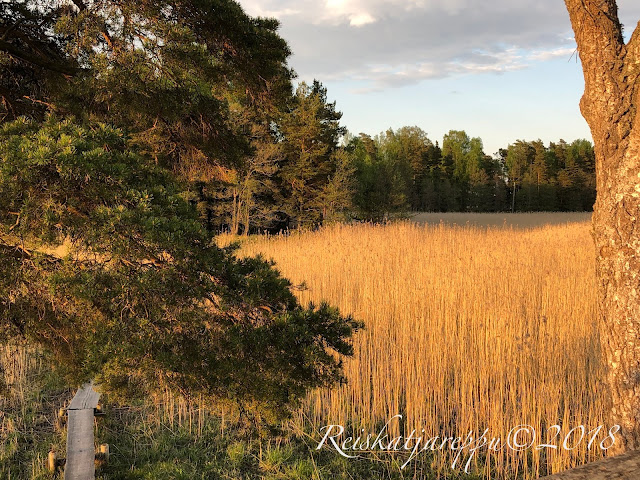 Aurinko kultasi vielä väritöntä ruovikkoa säteillään. Lintujen laulua kuului ruovikossa, mutta mitään emme nähneet, muuta kuin jättisuuren hämähäkin kutomassa verkkoaan.