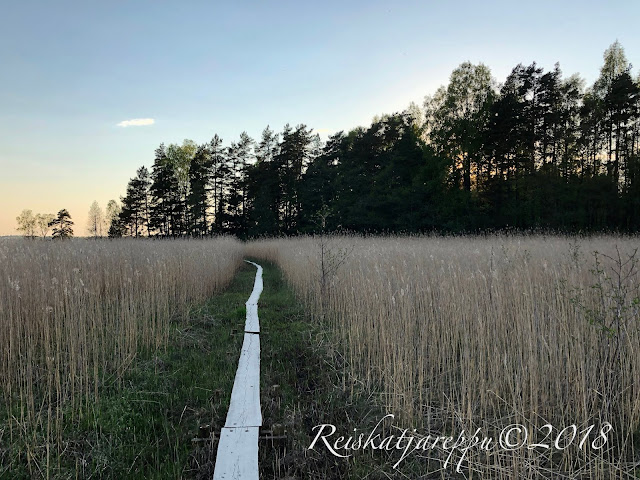 Sillalla oli kielto, ettei sillalla saa oleskella, mutta sen verran kumosimme kieltoa, että otimme parit kuvat. Sillan kupeesta lähti polku lintutornille… pitkältä tuntuva matka pitkospuita (n. 250 m) pitkin ruovikon läpi. Hyvää tasapainoharjoittelua!