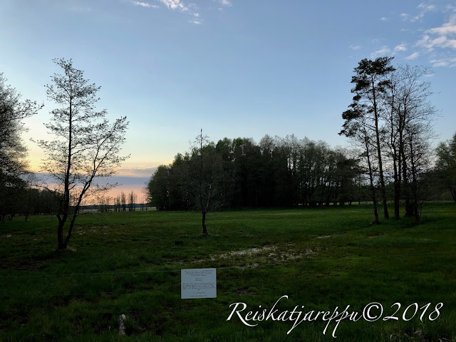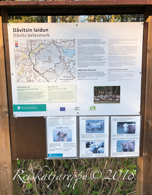 Lintujen sirkutus ja pörriäisten pörinä seuranamme kävelimme laitumella. Ei näkynyt lampaita eikä lehmiä, muuta kuin ilmoitustaulun kuvissa! Mutta näkyi muurahaispesiä, isoja ja monia pesiä melkein vieri vieressä. Siis pieniä eläimiä oli miljoonittain, ettei oikein halunnut jäädä paikoilleen seisomaan.