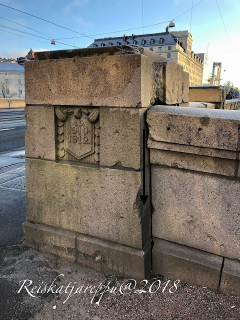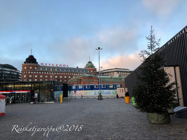 Kävelyretkemme päättyi Hakaniemen torin kautta autolle. Hakaniemen kauppahalli on korjauksen alla, josta hallia pikkuisen pilkistää rakennustyömaan sinisten aitojen yläpuolella. Korjaus on aloitettu maaliskuussa 2018 ja sen on arvioitu kestävän jopa kolme vuotta. Sivulla vasemmalla näkyy väistötilat, jossa kauppahallin liikkeet väliaikaisesti toimivat. Metropysäkki vasemmalla.