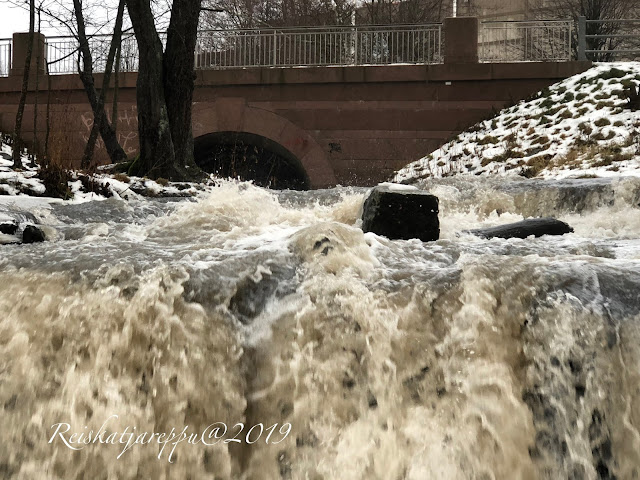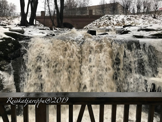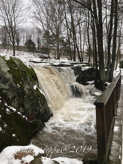 Puisto oli talvikelillä haastava, joskin vesisade oli pehmittänyt puiston peittävää jääkerrosta. Vielä kun iski kantapäät kunnolla pehmenneeseen kerrokseen, niin tuli minimoitua liukastumisen riski. Puistossa lapset laskivat pulkkamäkeä puiston reunoilta joelle päin. Pulkkamäen aikaansaamat jäljet lisäsivät puiston liukkautta. Pääasia kuitenkin, että lapsilla oli hauskaa. Näin aikuisina emme halunneet laskea mäkeä seisovilleen emmekä kyykyllään, eikä ollut pulkkaa mukana. Kuitenkin pääsimme putouksen alapuolella olevalle sillalle, joka oli oivallinen paikka kuohujen kuvauksiin.
