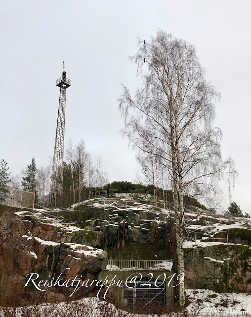 Puiston toisella laidalla vastapäätä huvimajaa, kohoaa korkea paljas kallio, jota koristaa radiomasto. Kontrasti on outo verraten puiston talvista kaudesta vastapäätä olevaan ei niin kauniiseen alueeseen.