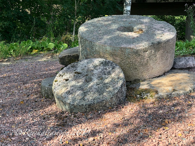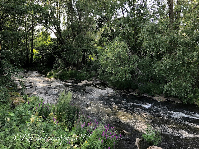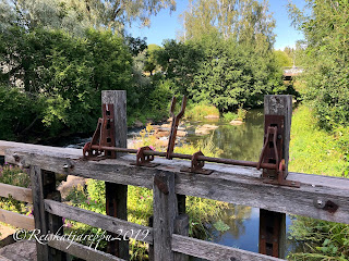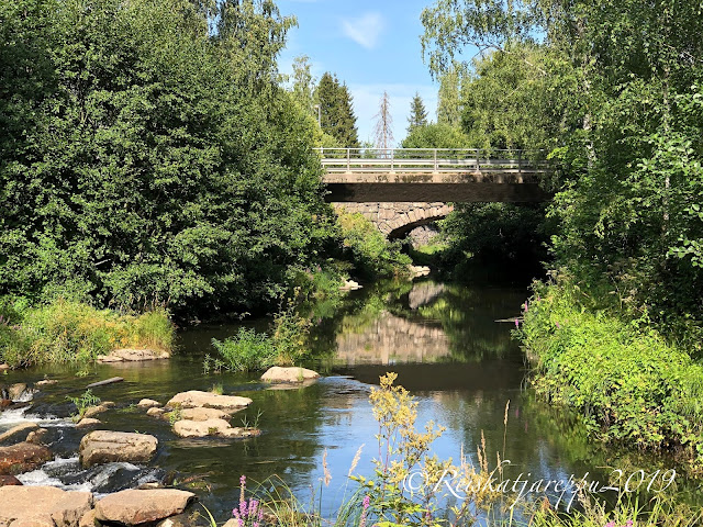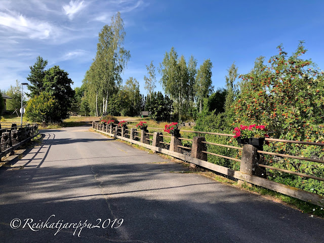 Meidän uteliaisuus voitti ja ajattelimme samalla käydä katsomassa millainen kylä Panelia on. Nimenä jo Panelia oli mielenkiintoinen. Ajoimme kylänraittia pitkin, kunnes silmiimme osui kaunis kivinen silta punaisine kukkineen. Sehän kolahti mieliimme ja tien toisella puolen oli myllyrakennus, jonka pihaan ajoimme parkkiin. Miten kaunista olikaan myllyn pihassa. Pieni koski kohisi aurinkoisessa, kesäisessä päivässä. Kaunis näkymä kohti kivisiltaa.