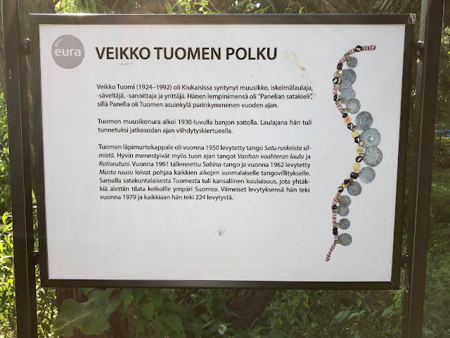 Kirkon ja meijerin takana katselimme, kuljeskelimme ja törmäsimme Veikko Tuomen polkuun. Nuoremmalle väelle ei varmaan kerro mitään, kuka on Veikko Tuomi, tämä ”Panelian satakieli”. Hän oli tunnettu muusikko/iskelmälaulaja 1950-1990-luvulla.