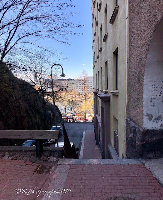 Siltavuorenrannalta nousimme pienelle kadulle, Oikokadulle, katu oli niin pieni, että portaat johdattivat meidät ylöspäin Kristianinkadun kulmaan. Kadun varrella tuolla ylhäällä on Helsingin yliopiston psykologian laitos.