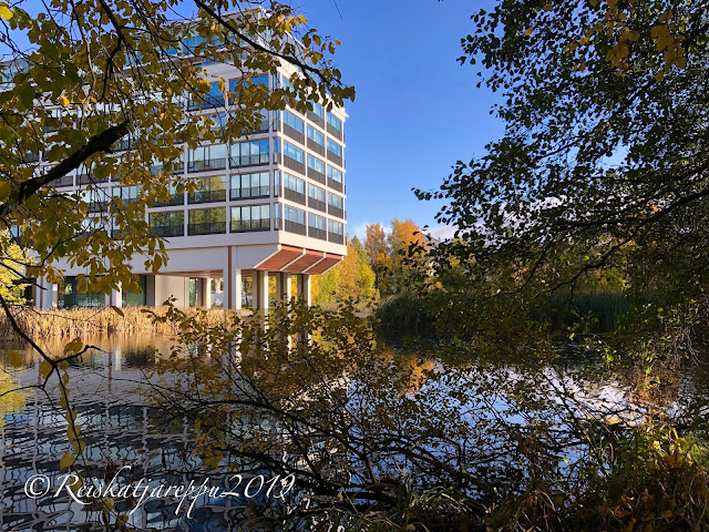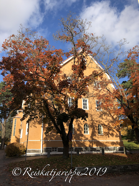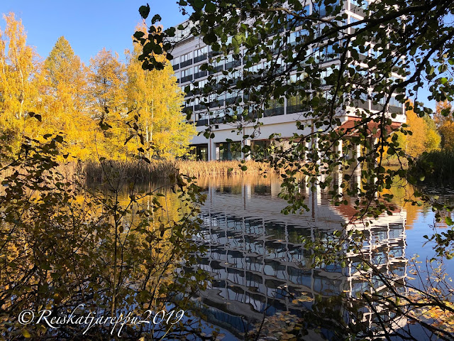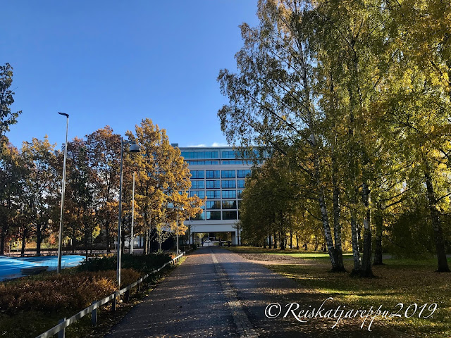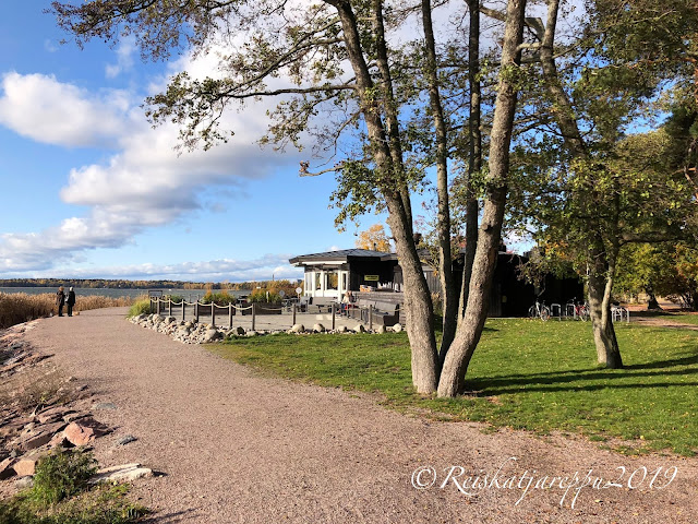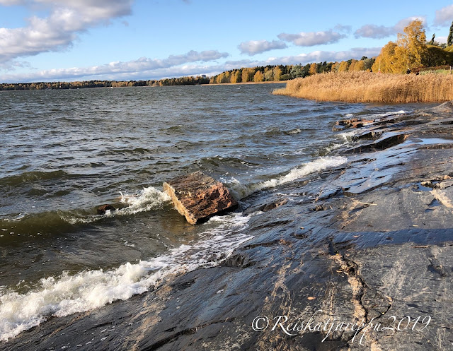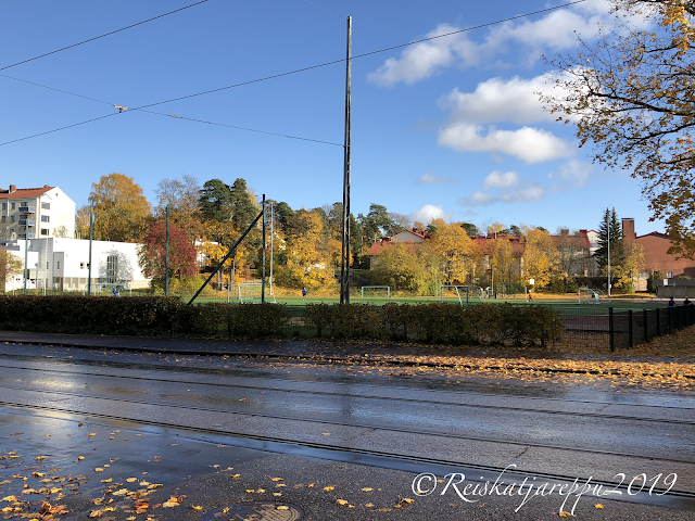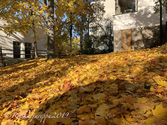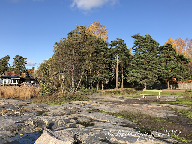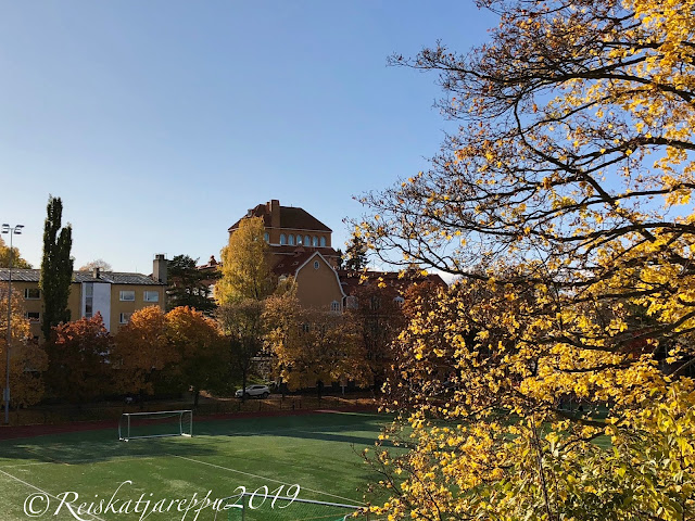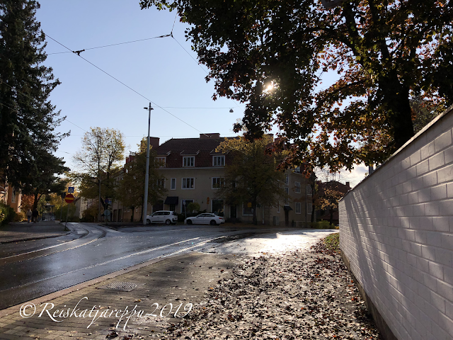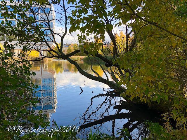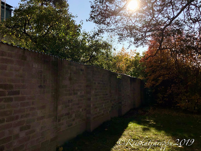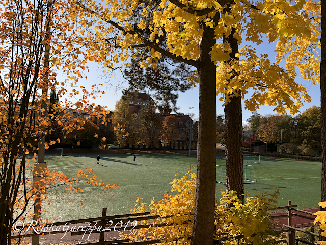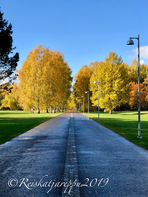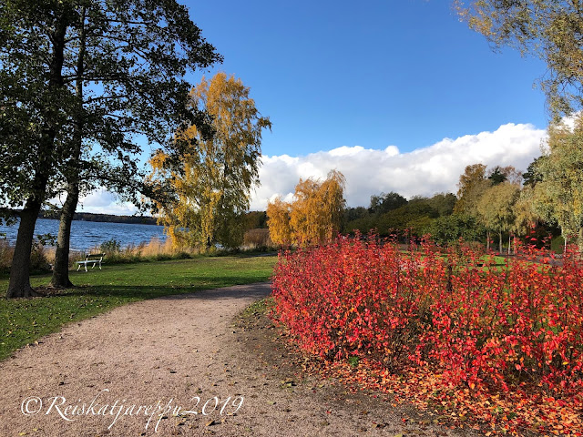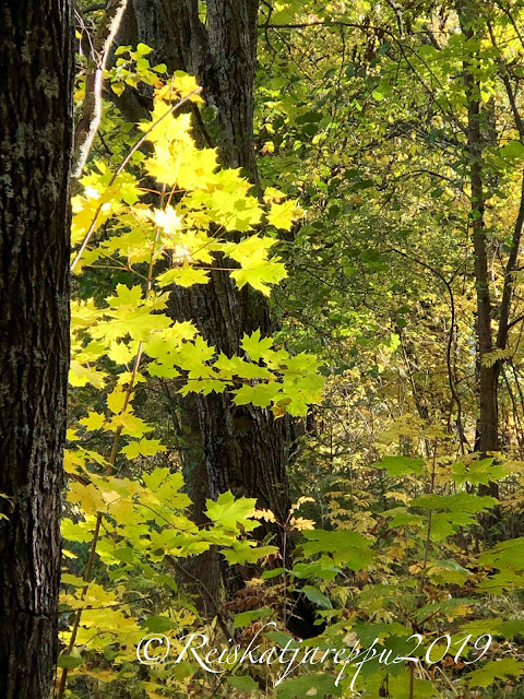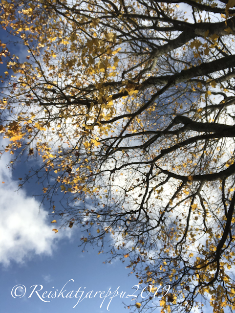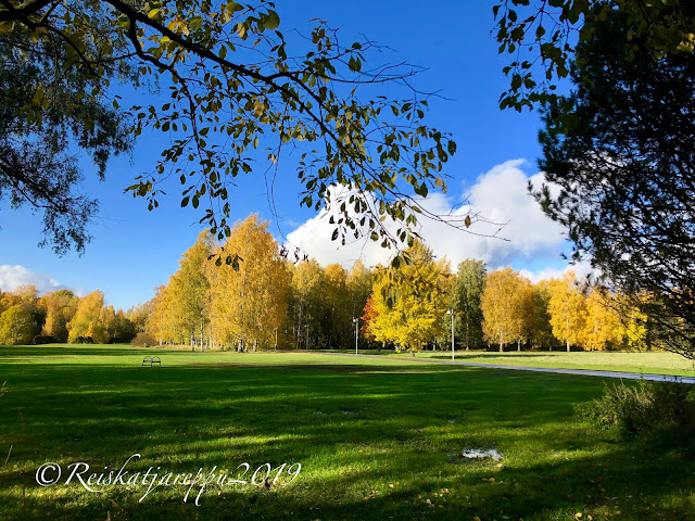 Matkamme jatkui Tuulaspolkua pitkin Munkinpuistoon. Sopivasti sattui kaunis ja lämmin syksyinen ilma meidän päiväkävelylle Krissen kanssa. Nautinnollista oli ihailla syksyn värejä, ja aurinkon valaisemia puita, tuoden syksyisen väriloiston oikeuksiinsa.