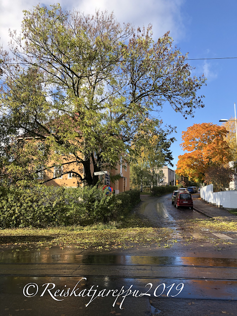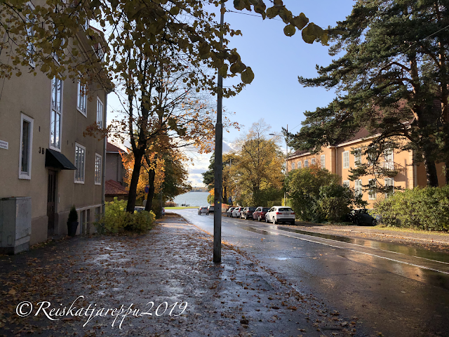 Sateen jälkeen on poutasää, kadut kiiltivät sateisen kosteina lehtimaton alla. Puiden ruskavärit hohtivat auringon valossa. Näkymä Laajalahdentieltä merelle. Kulmasta näkymä Tillimäen toiseen suuntaan.