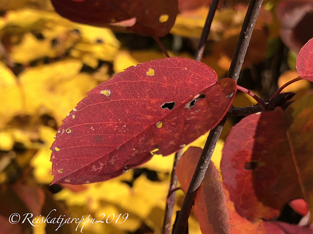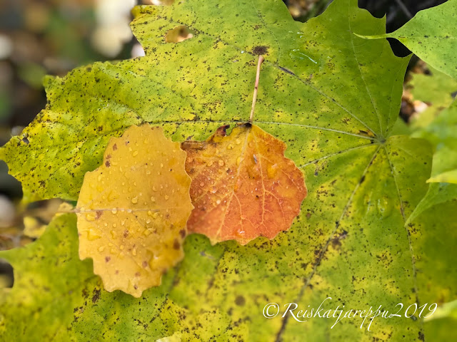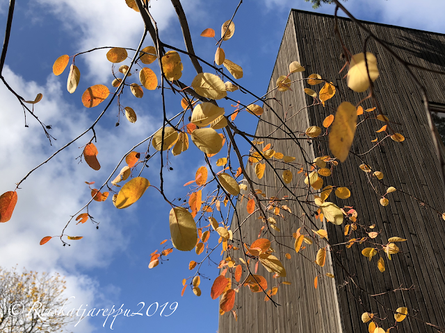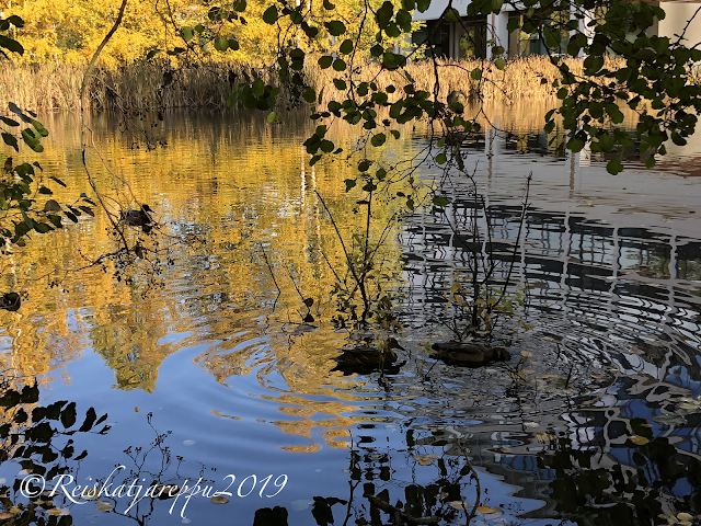 Kävelimme lammen puolelta, emme talon alta. Kyykimme ja kuvasimme kuten tapoihimme kuuluu. Välillä jysähdimme paikoillemme. Lehdissä, puissa ja sorsissa oli kuvattavaa. Ja värit olivat niin houkuttelen herkullinen ihanat.