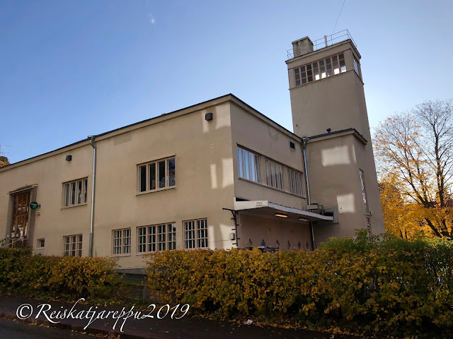 Munkinpolku muuttui Laajalahdentien ylittäessään Riihtieksi. Kulmassa oli tämä, jonka arvelimme jo ulkonäen perusteella olvevan paloasema, kuten se sitten olikin. Nykyään rakennuksessa toimii Munkkiniemen nuorisotalo. Rakennuksen on suunnitellut L.E.Hansten, ja se valmistui 1931. Laajennuksen se sai 1936. Omistajana on Helsingin kaupunki.