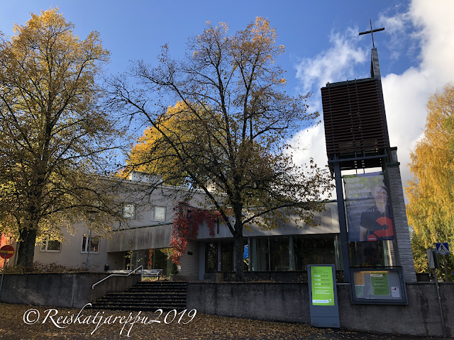 Tässä seisoo Munkkiniemen kirkko Munkinpolulla, joka on valmistunut 1954. Kirkon on suunnitellut arkkitehti Pauli Salomaa. Kirkko ei ollut oikein meidän makuumme eikä ihan ensi silmäyksellä kirkoksi ajatellut ennenkuin nosti katseensa korkeammalle.