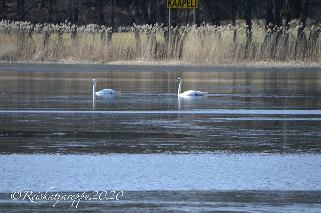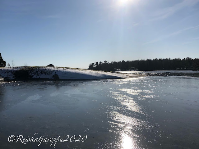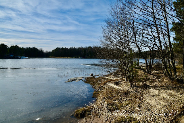 Uimarannan kohdalla oli hieman jäätä, mutta keskemmällä merenlahti oli jo vapaana jäistä. Liikennettä oli merellä, joutsenpariskunta lipui rauhallisesti kaksistaan sekä mies ja nainen soutelivat veneellä. Lahden varjoisemmalla puolella mies ajeli moottoriveneellä jäitä särkien. Rouske vain kuului ja koiratkin ihmeissään kuunteli.