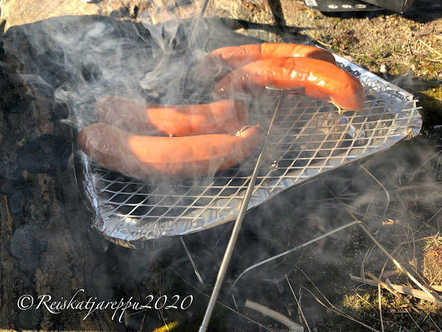 Retkemme ei ollut pitkä ja ulkoilualueet eivät olleet isoja, mutta saimme ainakin olla rauhassa, pois ihmistungoksesta ja parasta; saimme ne kevään ekat makkarat.