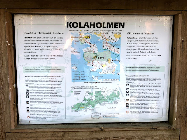 Lövöntietä pitkin saavuimme sitten Kolaholmeniin. Heti tien varrella oli pieni pysäköintipikka ja siinä kyltti ja opastetaulu Kolaholmenista.