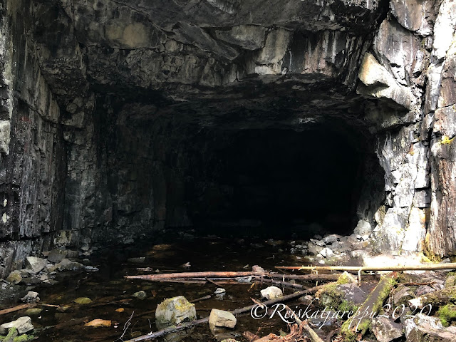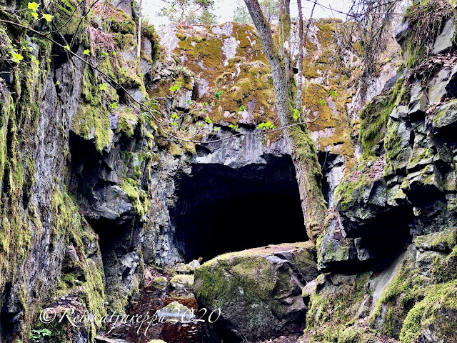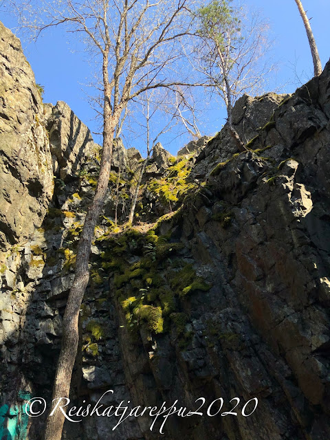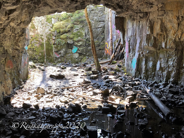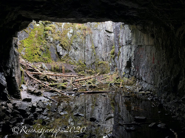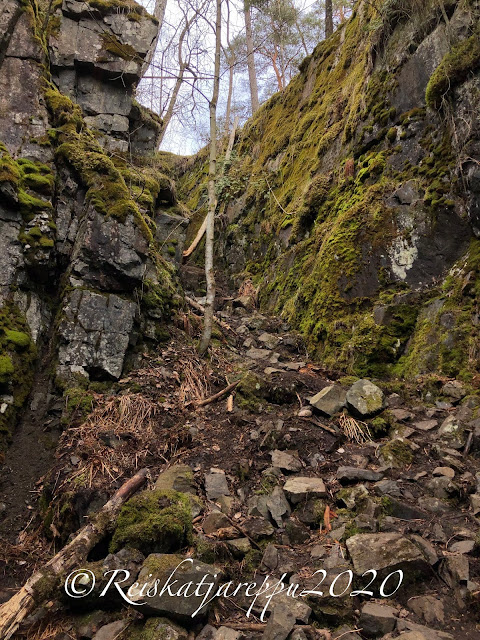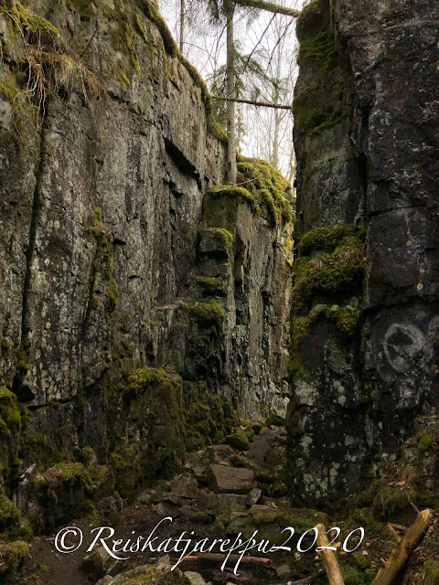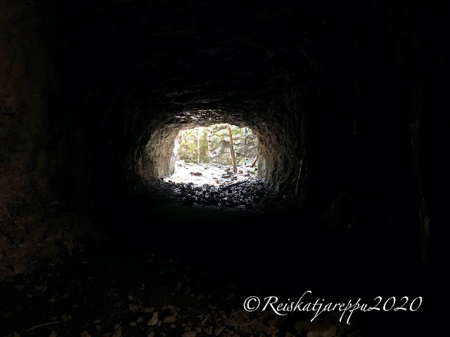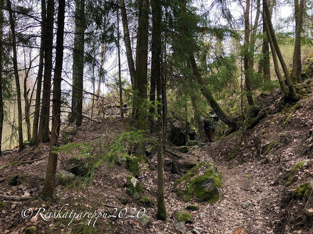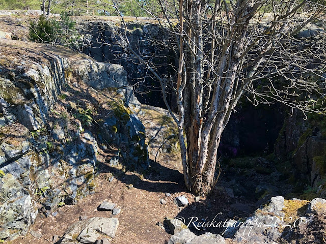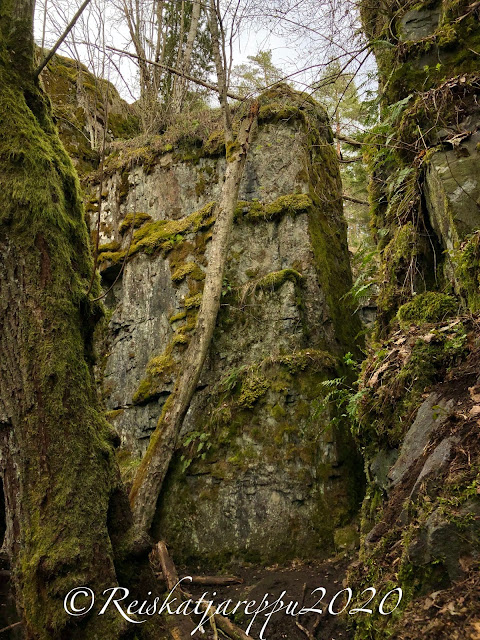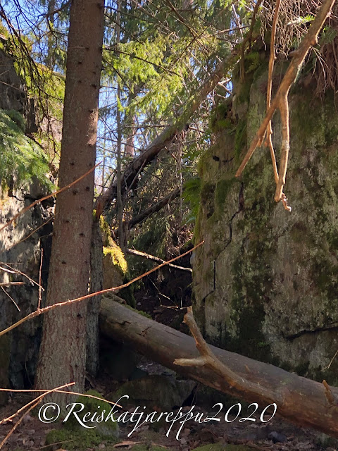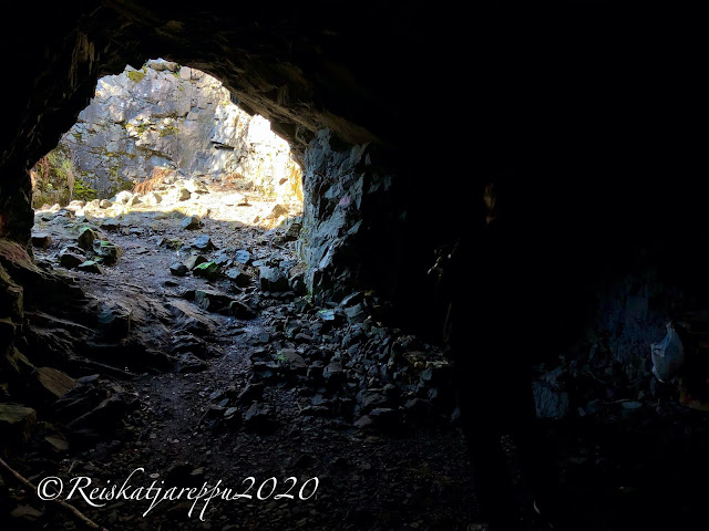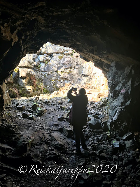 Tämän polun varrella sitten yllätys piilikin, kun näimme yhden yhdyskäytävän kohdalla jonkin majan tapaisen rakennelman, ja päätimme käydä katsomassa sitä. Sieltä paljastui rotko ja kaksi aloitettua luolaa. Luolat olivat komeita ja samoin kalliot niiden luona. Voi, että nämä ovat niitä hienoja yllätyksiä, jotka tulevat vain yllättäen vastaan.