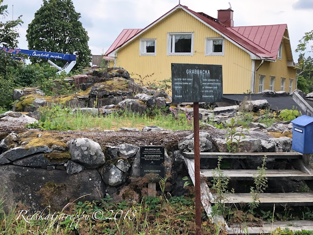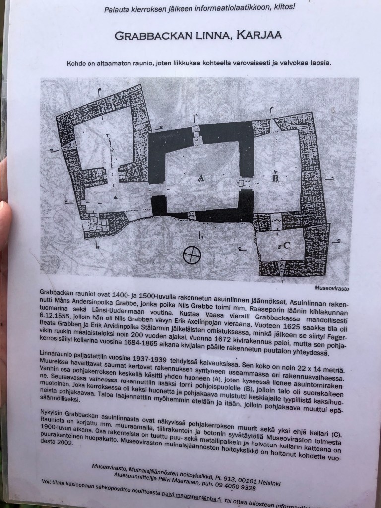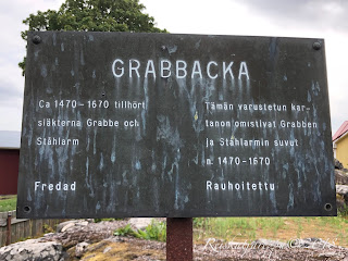 Nti Navi ohjeisti meidät Hankotieltä kääntymään kohti Antbyn kylää. Muutaman kilometrin päässä olikin jo Nähtävyysmerkki Grabbackan linnoitus 100 m. Kääntymisen jälkeen tuli hämmentynyt olo, kun saavuimme maalaistalon pihaan. Kuitenkin kyltti siellä osoitti raunioiden olevan 50 m päässä ja siinähän ne sitten meidän edessä olikin.