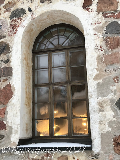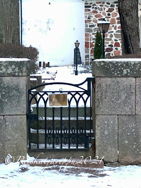 Ei näkynyt joulukuusta valoineen, nähtiin kadulla jouluvalot. Jatkoimme kirkolle katsomaan, miltä näyttää jouluinen kirkko. Kirkko näytti kauniille, rauhalliselle, samoin kirkon alue pappiloineen. Sisällä paloi kutsuvasti jouluvalot ja ulkona aidan vieressä oli kynttilälyhty. Kirkkoa kiertäessämme hiljaisuuden rikkoi urkujen soitto, joka tuntui mystiselle. Ovet olivat lukossa, joten oletimme kanttorin siellä soittelevan.