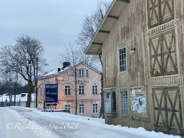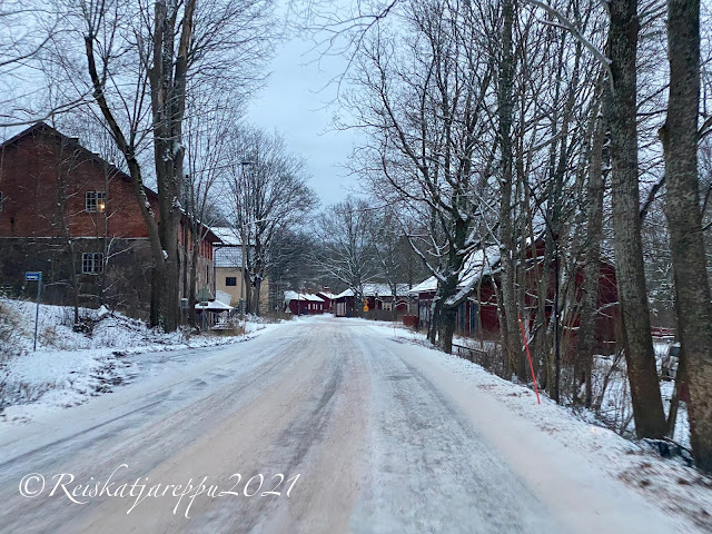 Jatkettiin matkaa ja silmiin osui Pinjaisen tienviitta. Isolta tieltä Billnäsin ruukkikylä on aivan tien vieressä. Päädyimme ihailemaan auton ikkunoista talvista kylää. Kylätie oli hiljainen ja valkoinen. Taivas hennon sininen, pilvinen.
