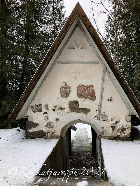 Kirkkokansan on täytynyt osoittaa nöyryyttä tullessaan kirkkoon tämän portin kautta, sen verran matala se oli. ( Ainakin meille). portti Puujärvelle päin.