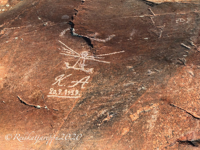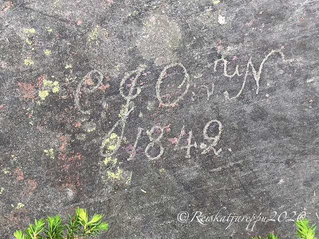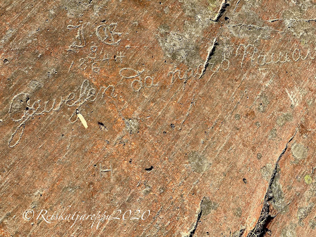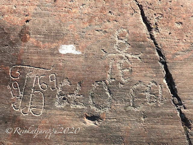 Päädyimme punaisille kallioille. Kallioilla on penkki, johon istahdimme nauttimaan vaan olemisesta. Yhtäkkiä katsoin jalkoihini ja näin kaiverruksia jaloissani. Kohta niitä näkyi enemmänkin. Hihkuin Krisselle, katso mitä täällä on. Niin me kykimme ja tutkailimme kallioiden kaiverruksia. Niitä oli useampia, oli nimikirjaimia ja vuosilukuja.