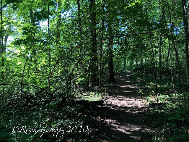 Menimme suorinta tietä tai polkua pitkin, joka melkein menikin talojen takapihan poikki. Oikopolkua pitkin kävelytielle. Ei me nyt ihan olleet missä sattuu, kun kova liikenne polulla kävi. Ihmisiä ja kottaraisia. Aurinko siivilöityi kauniista puiden lomasta ja lintujen laulukuoro on kovin viehättävää kesäisessä maisemassa.