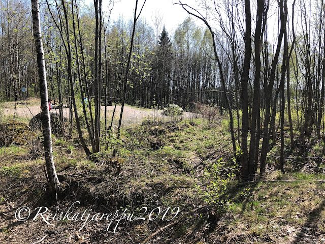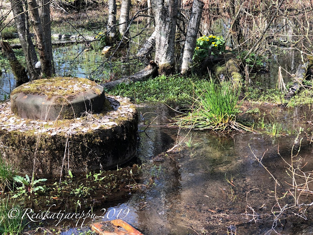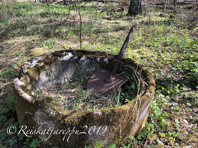 Polku kiersi osittain kentän aidan viertä, välillä jouduimme siirtymään kauemmaksi aidasta. Pieni polku kutsui meidät poikkeamaan metsäsaarakkeella. Sieltä löytyi vihjeitä, että siinä oli joskus sijainnut talo. Omenapuita, marjapensaita, tuo rengas ja jäljelle jäänyt lapion terä. Luonto ottaa omansa ja vähitellen jäljet peittyvät kasvustojen alle.
