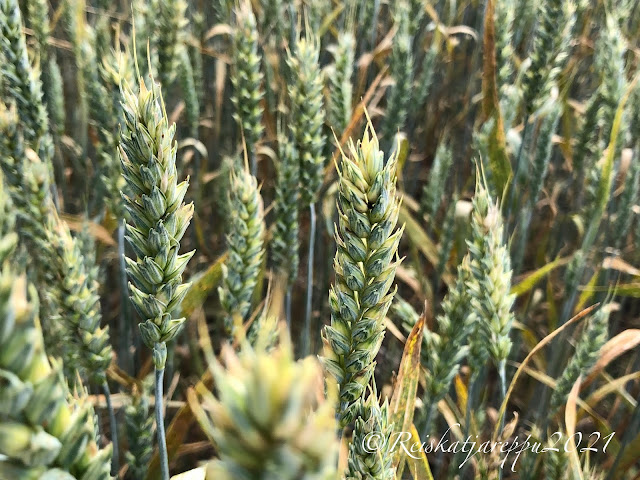 Vehnää ja kauraa kasvoi viljelyksillä ja varovasti sipsuttaen kävelimme, ettemme talloisi viljelyksiä. Ojan toisella puolella lähellä Hermolanvahaa olikin viljanpuinti käynnissä. Ei mitenkään tullut semmoinen olo, että kyseessä olisi erittäin kiinnostava nähtävyys, kun just ja just näimme, että joku muu oli kulkenut ennen meitä lohkareella. Ei ollut tunkua kohteelle.