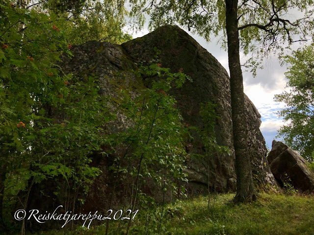 Siirtolohkare oli vaikuttavan näköinen, mutta ympärillä olevat keskenkasvuiset puut peittivät lohkaretta pellolta katsottaessa. Pääsimme kuitenkin kiertämään lohkareen ja komea se oli jyrkkine seinämineen. Mustat pilvet pyörivät ympärillä, mutta ei satanut. Sopiva ilma reissulle.
