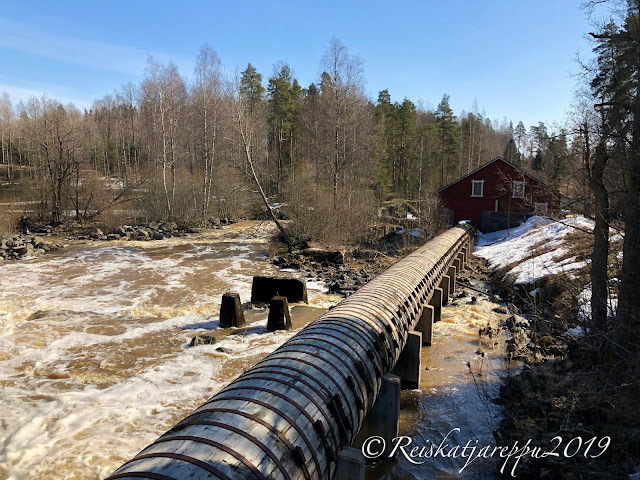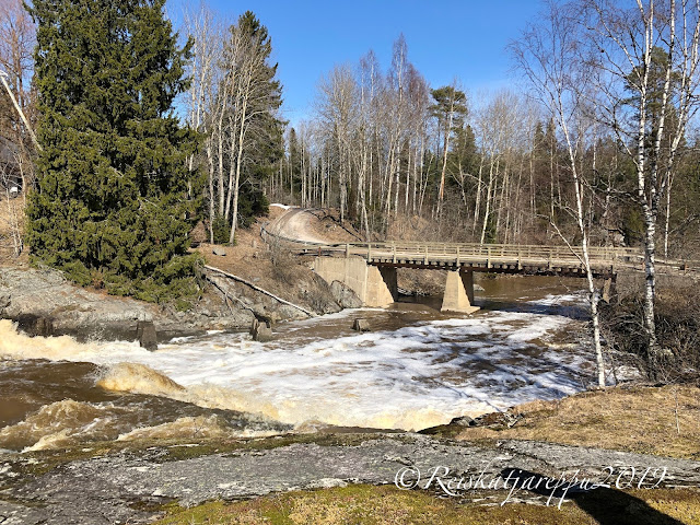 Meijeritiellä kosken partaalla oli vanha meijeri, joka on nykyään yksityisomistuksessa, joten emme käyneet sitä kuvaamassa. Viehättävä puinen silta johdatti meidät sillan yli kosken toiselle puolelle, jonne saimme auton pysäköityä. Muitakin kosken kuohujen katselijoita oli liikkeellä, mutta ei haitaksi asti. Keväinen sää ja hienot kuohut olivat saaneet porukkaa liikkeelle. Emmekä yhtään ihmetelleet, sen verran hienolta paikka näytti.
