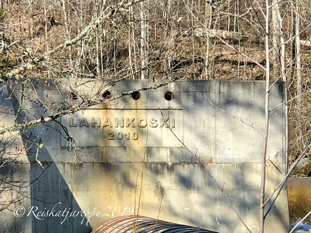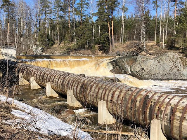 Lahankoski olisi kaunis ilman tätä rumaa putkea ja valjastettua koskea. Komeat kuohut silti, mutta tuo putki pilaa kauniin näkymän. Vesi kulkee tuota puuputkea pitkin myllyn sisällä olevaan turbiiniin ja tuottaa siten sähköä.