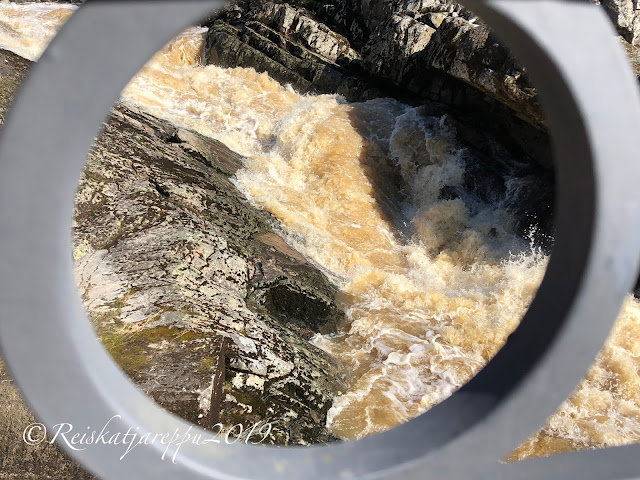 Rakennuksen alapuolella oli tasanne, josta oli suora näköala kosken kolmanteen putoukseen ja alavirtaan. Hieno paikka istuskella nauttimassa kahvia kosken kuohuja katselemassa. Me katselimme kuohuja aidan renkaan reiästä.