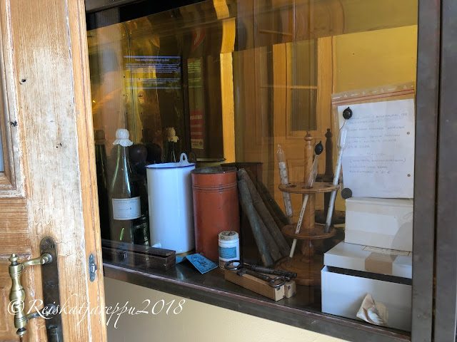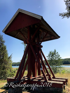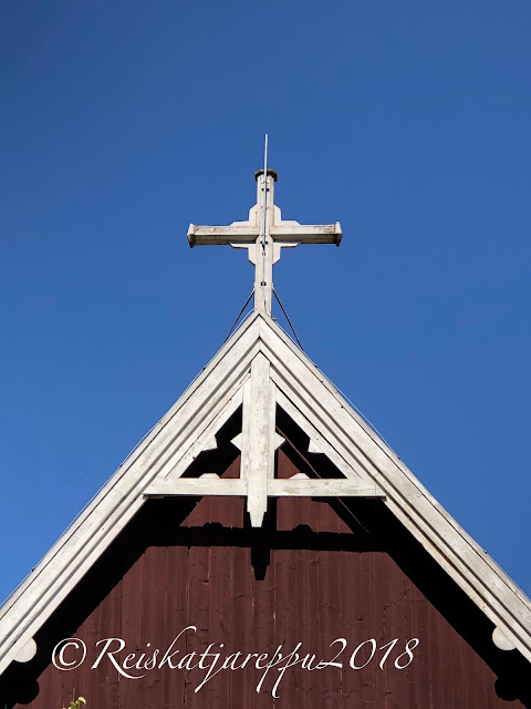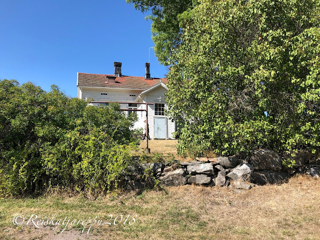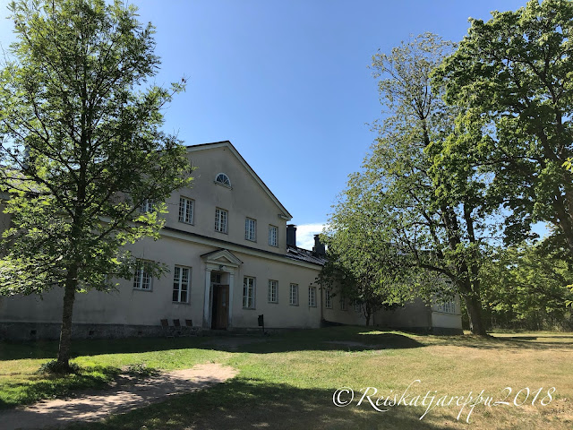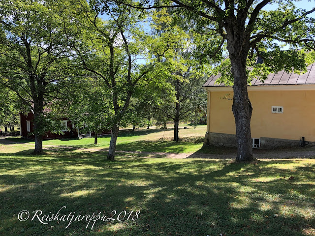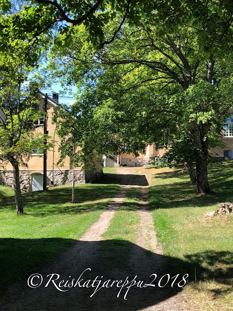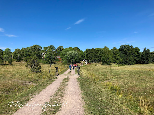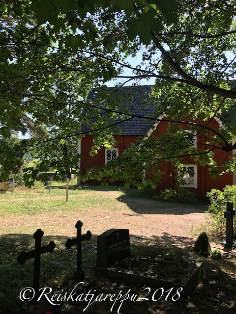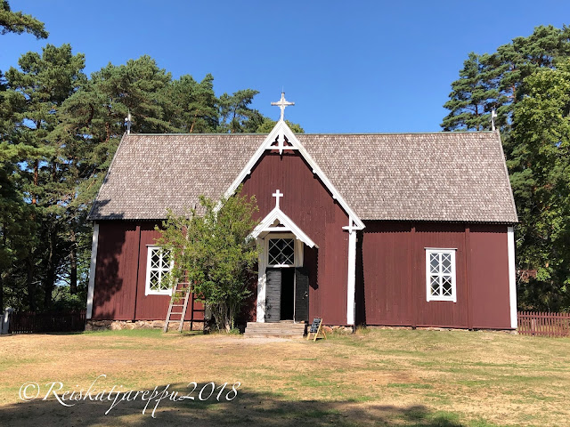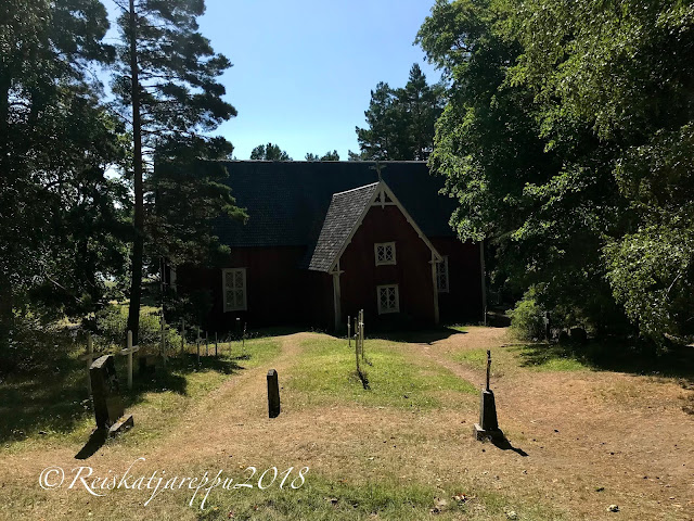 Päivä oli helteinen, liiankin lämmin, olisi ollut oivallinen rantapäivä. Lauttamatka antoi hetken viilennystä, joka haihtui kävellessä entisen sairaalan alueelle. Saaren luonto on vehreää ja hiekkatietä ympäröi maalaismaisemat. Kävelimme suoraan kahvilaan nauttimaan raikkaasta juomasta ja aurinkovarjon tuomasta varjosta. Lepo ja juotava teki terää jatkaaksemme matkaa katsomaan kirkkoa, joka meitä kovasti kiinnosti ja sen historia.