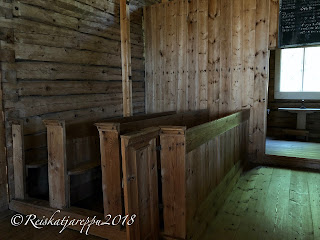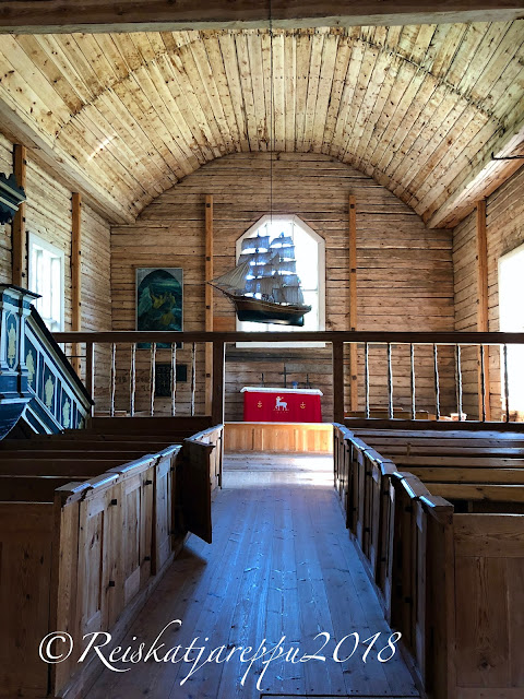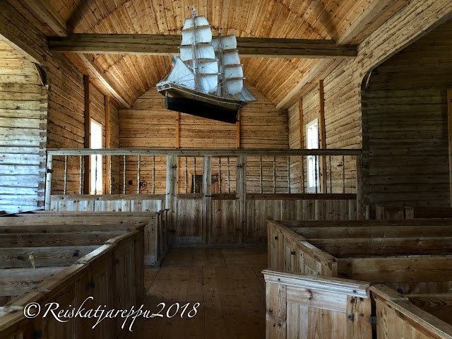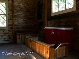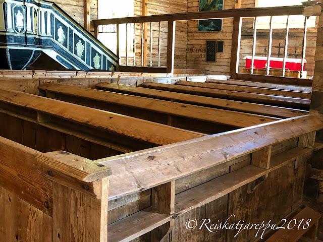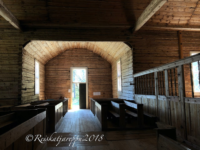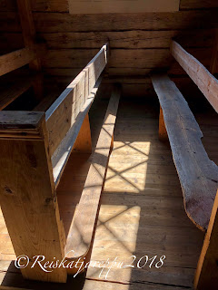 Sisätiloihin astuessa olo oli tyrmistys. Emme olleet Krissen kanssa koskaan vielä käyneet tälläisessä kirkossa. Näky oli karu, niin pelkistetty, ettei oikein tiennyt sanooko mitään. Sisätilat ovat lähes alkuperäisessä kunnossa, joitain penkkejä ja lattiaa on korjailtu. Seinät ovat piiluhirttä, katto sahalautaa ja ne ovat käsittelemättömiä.