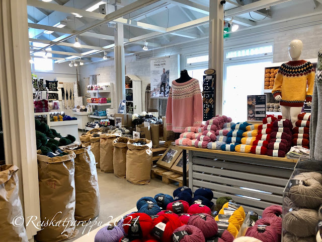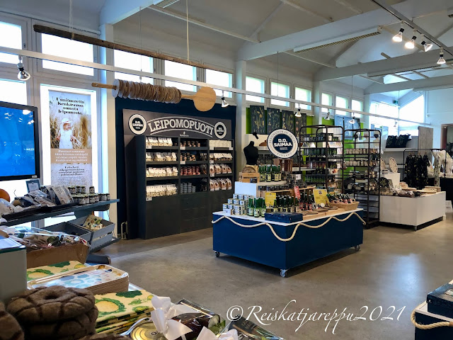 Edessä näkyy käsityömyymälä, jossa on myytävänä paikallisten tuotteita hilloista julisteisiin ja Taito Shop-ketjun tuotteita, villalankoja ja erilaisia käsityötarvikepaketteja. Kaikenlaista mukavaa.