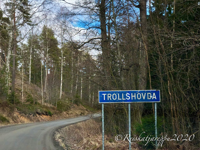 Loppumatkasta tie muuttui soratieksi vähän ennen Trollshovdaa. Luulimme tien päättyvän talon pihaan, mutta talon nurkalta tie jatkui mutkan takaa ja näimme kohteemme olevan edessä. Kuvassa tuolta ylhäältä ajelimme tänne alas.