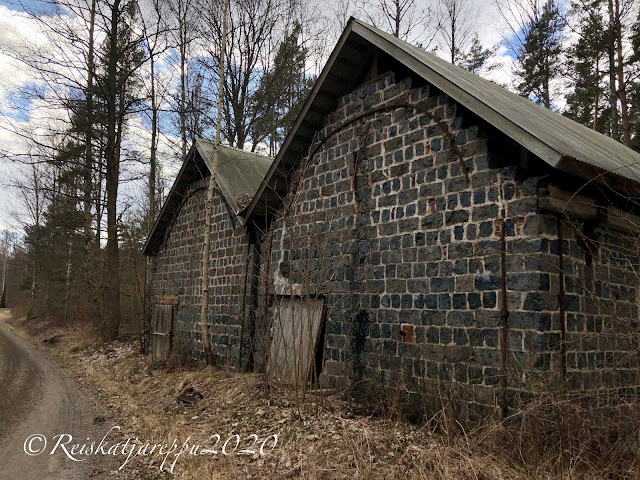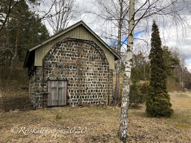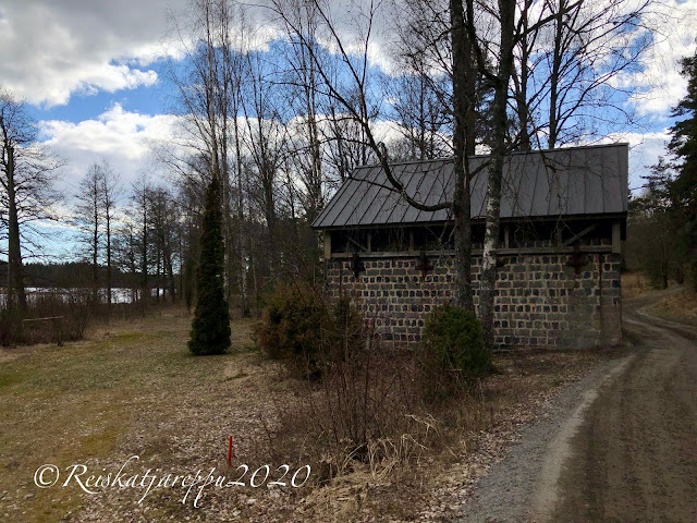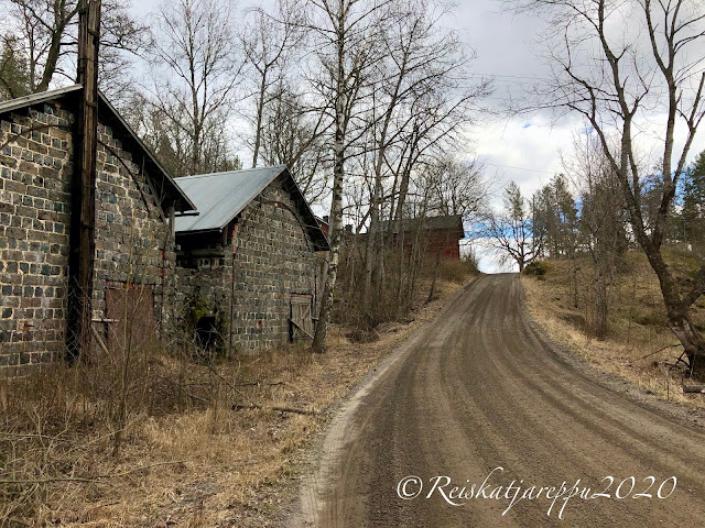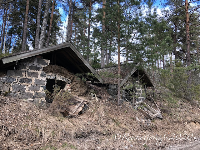 Jatkoimme vielä jonkun matkaa ruukilta eteenpäin ja tien vieressä olivat nuo kaksi pientä rakennusta; kellareita? Jonkun matkan päässä oli rannoilla kesäasuntoja ja muita rakennuksia. Nainen tien reunalla moikkasi meille iloisesti, liekö ajatellut meitä tutuikseen. Tie olisi jatkunut Perniöön saakka, mutta käännyimme takaisin, kun emme halua olla rajan rikkojia.