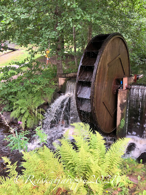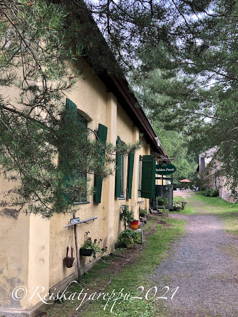 Vatsat pullollaan ja vireystila korkealla matkamme jatkui Mathildedaliin. Yhtä kauniina avautui puukuja kuin ennenkin, mutta hämmästyksemme oli suuri, kun tien varteen oli tullut tenniskentät ja minigolfradat. Ja ihmisiä, hyvänen aika miten paljon ihmisiä. Emme meinanneet löytää parkkipaikkaa, kun rantaparkki oli pullollaan autoja. Kiersimme vain yhden rakennuksen ja päätimme lähteä väljemmille vesille Teijoon.