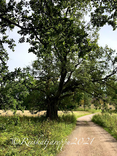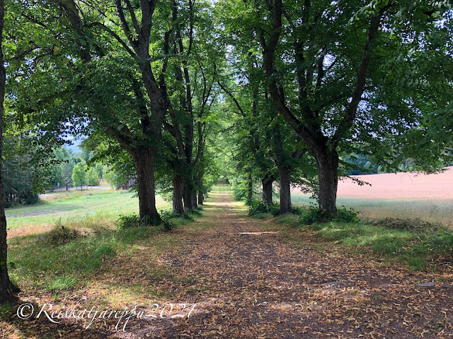 Puukujaa kävellessämme kuvittelimme olevamme kartanon herra ja rouva. Krisse kävelykeppeineen ja minä pitkine hameineen olkihattu päässä aurinkovarjao kädessä. Kaikkea se mielikuvitus ja hieno puukuja saa aikaan.